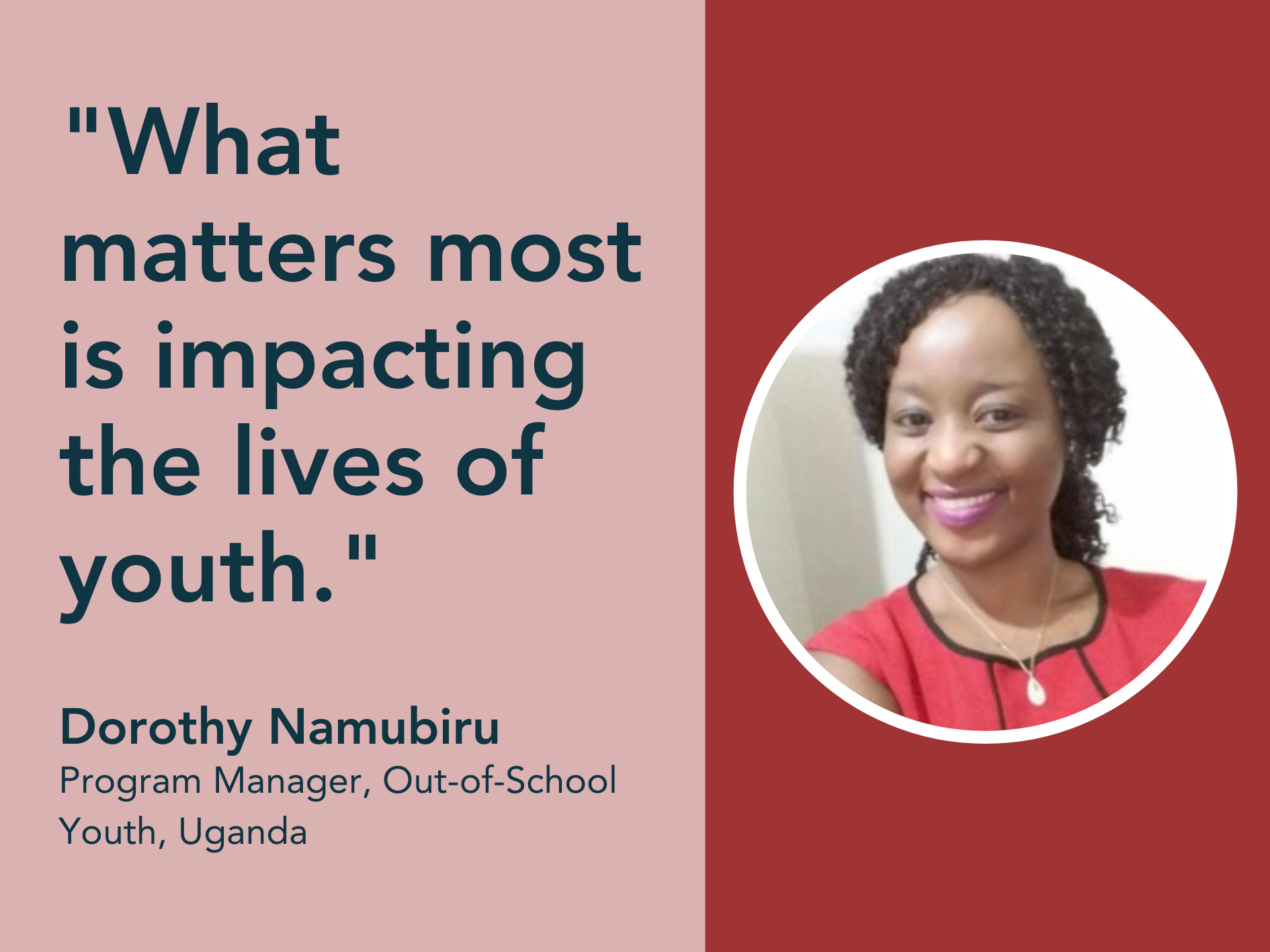 Program Manager, OOSY in Uganda, Dorothy Namubiru shares her thoughts on Youth First, Impact-Obsessed and what it means to her. Dorothy has been with Educate! since 2015.